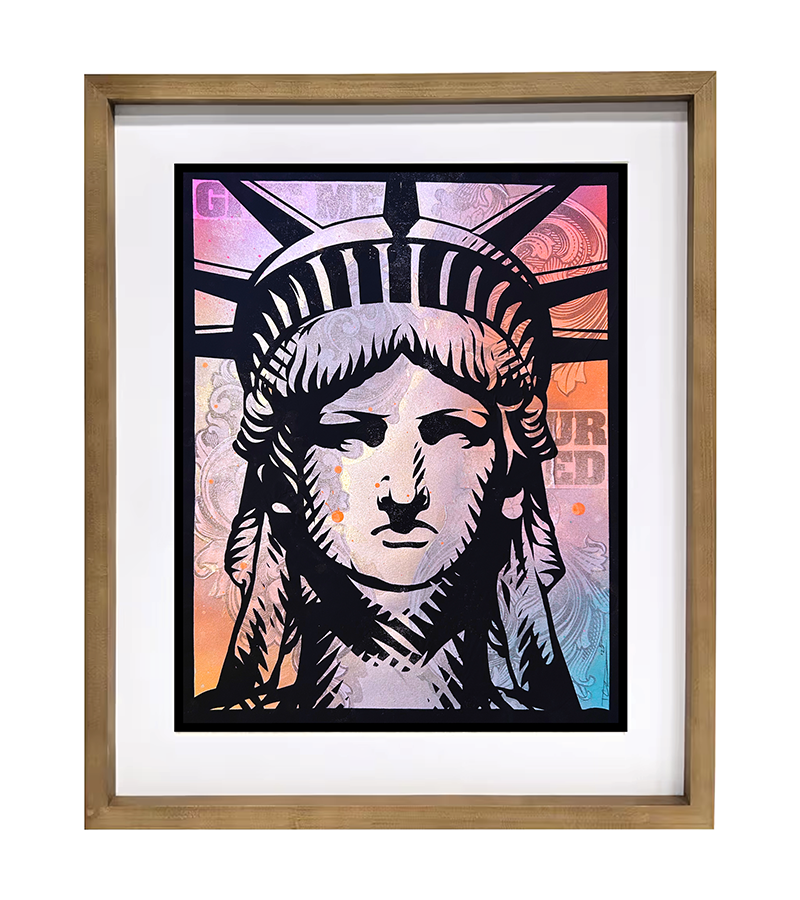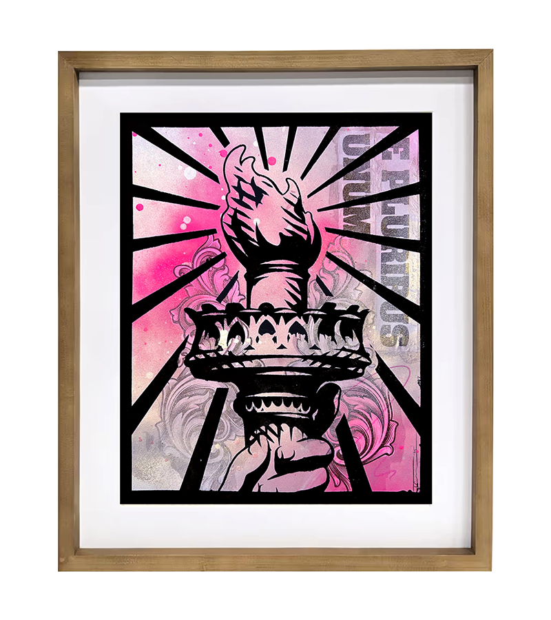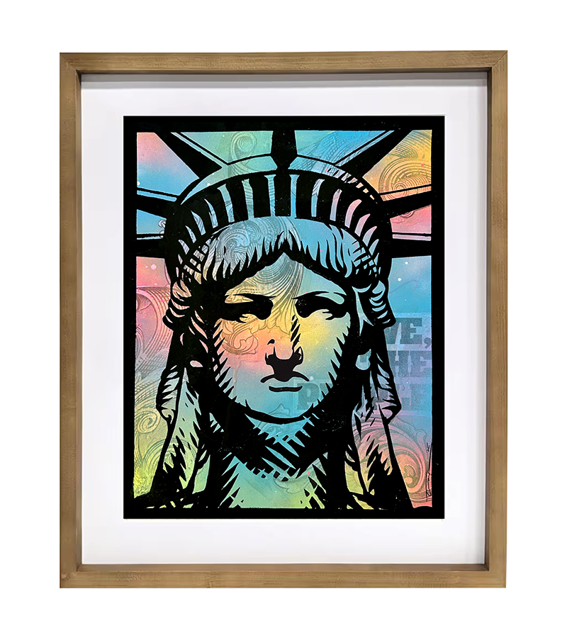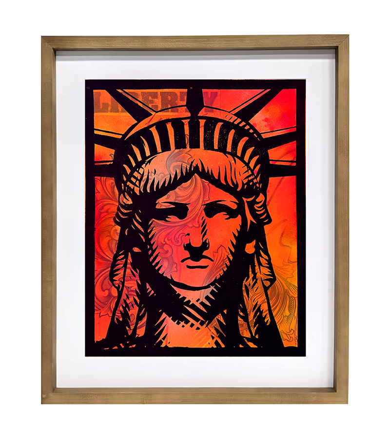Custom engraving-style illustrations, phrases from historical texts, and base mediums form the core of each piece, yet through rearranging, tinting, and hand-printed iterations, something unique is born. The works encourage the viewer to look beyond the surface, notice the similarities and differences, and remember that our collective assemblage makes us more powerful as a society and a nation.”