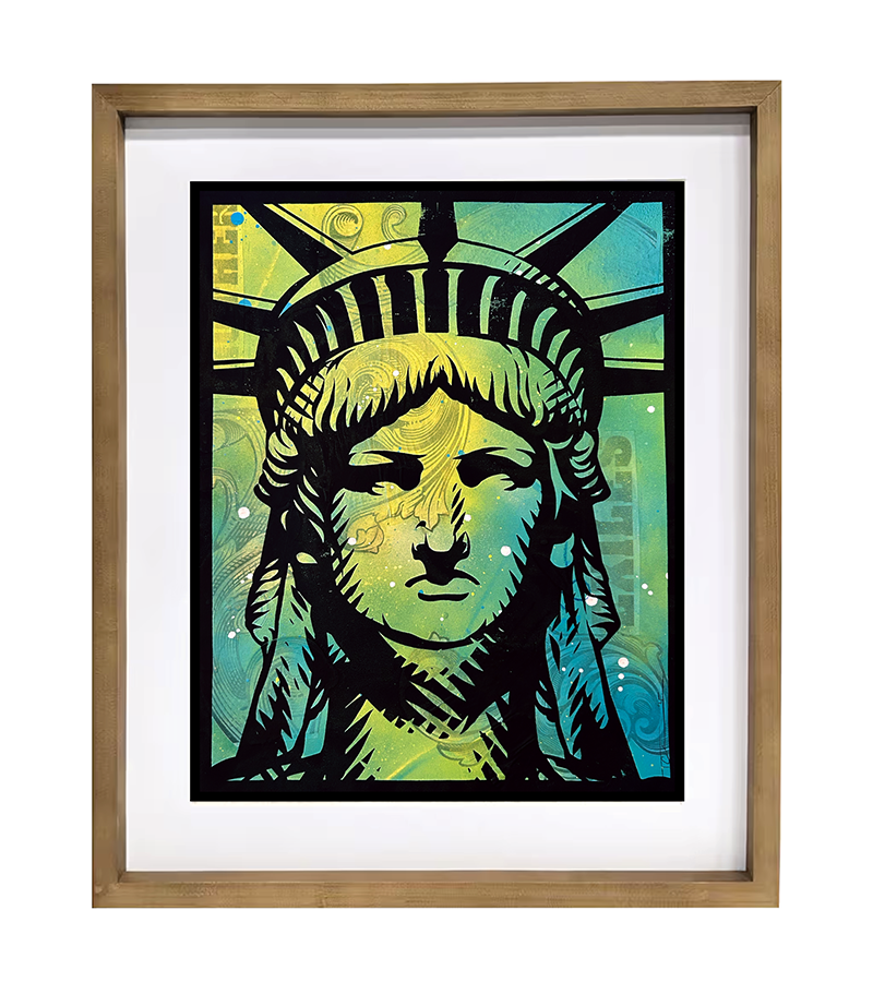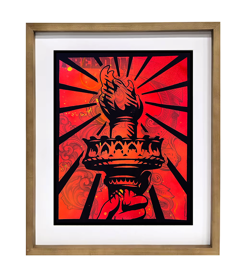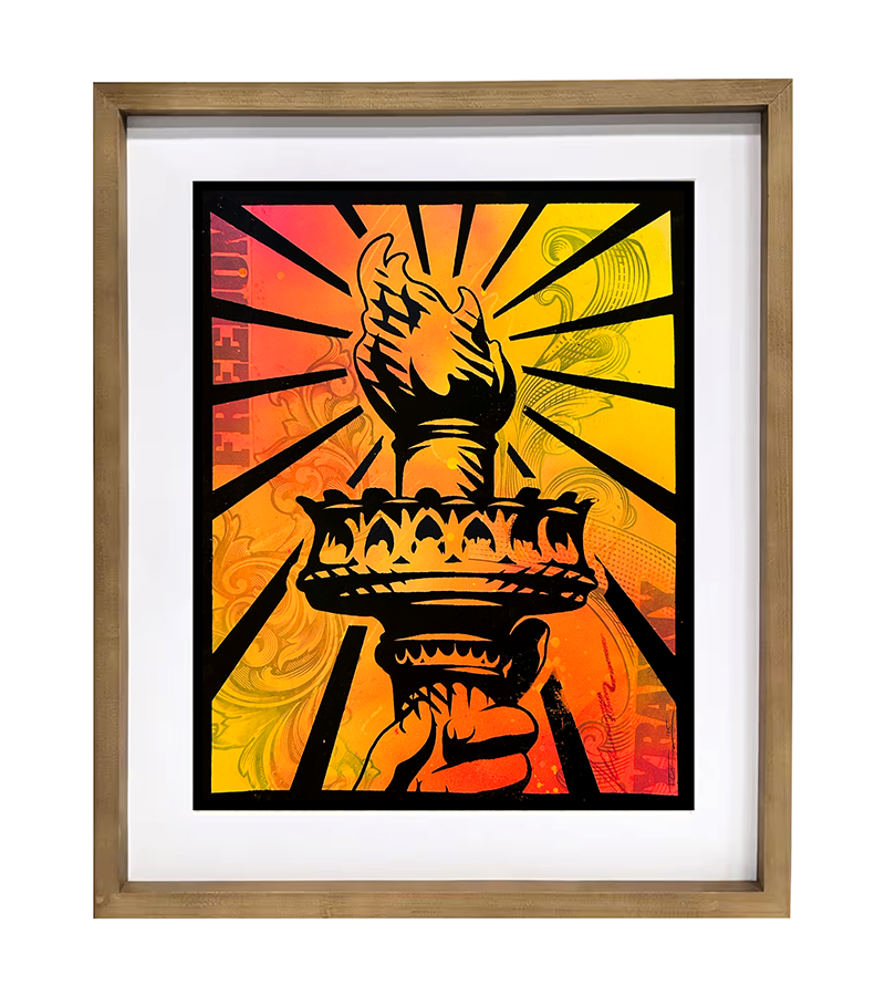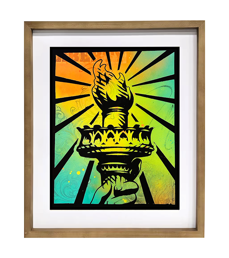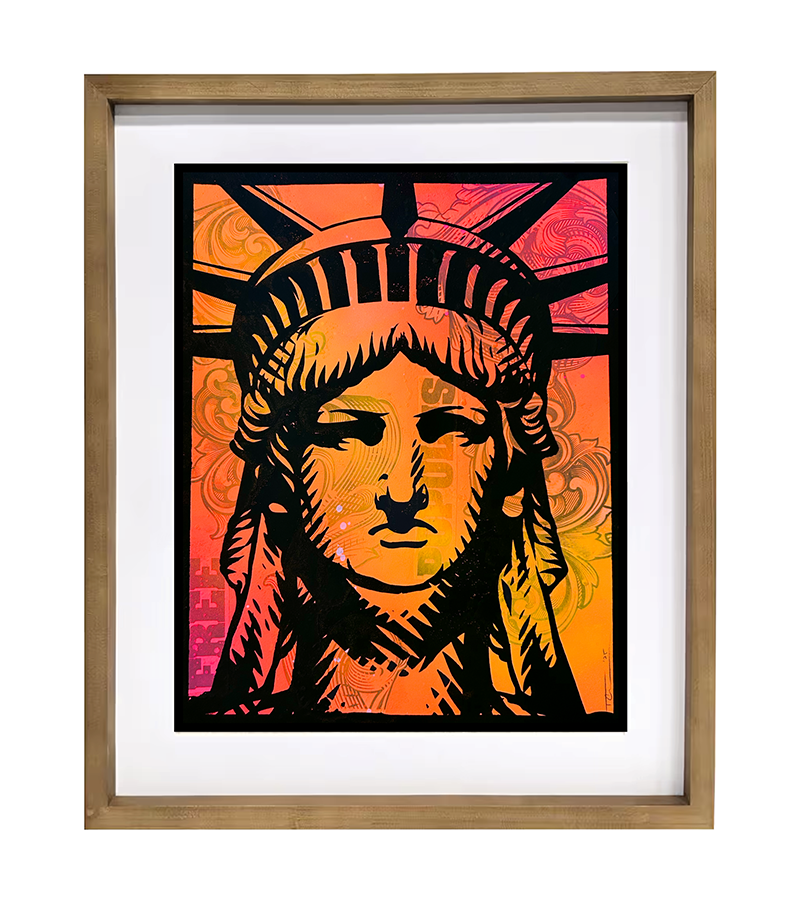 Custom engraving-style illustrations, phrases from historical texts, and base mediums form the core of each piece, yet through rearranging, tinting, and hand-printed iterations, something unique is born. The works encourage the viewer to look beyond the surface, notice the similarities and differences, and remember that our collective assemblage makes us more powerful as a society and a nation.”